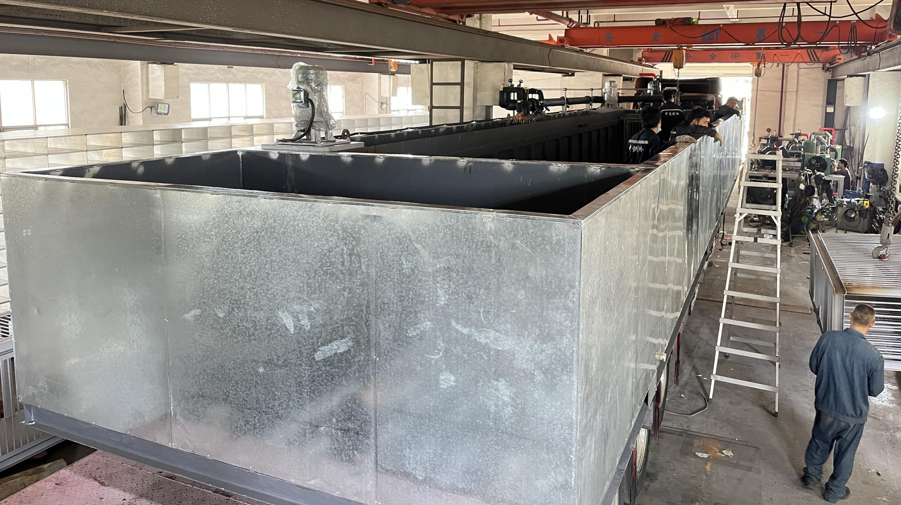 制冰池内先灌满盐水,蒸发器会对盐水进行降温处理,直至达到所需低温。向冰模中注入定量清水后,将其放入冷却后的制冰池内,借助低温盐水的制冷作用,使冰模内的水逐渐冻结成冰。出冰流程如下:先将 m 个冰模横向固定为一组,整体排列成 n 排,并用钢架进行稳固;为提升制冰效率、加快冻结速度,会通过搅拌器促使盐水在冰模之间均匀循环流动。待冰模内的水完全冻结成冰后,利用行车装置将整架冰模吊运至融冰池,浸泡 2-3 分钟让冰块表面轻微融化,随后将冰模放置在倒冰架上,冰块便能轻松脱离冰模,倾倒在带坡度的滑冰道上,最终滑入送冰车内。完成出冰后,向冰模重新注入清水,再放回制冰池内,开启下一轮循环制冰。